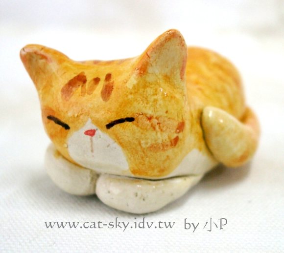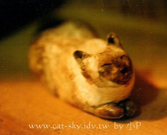 學生時代,喜歡畫畫,做美勞,因為很窮,沒什麼零用錢,只能買到文具店賣給小朋友玩的紙黏土來玩.....認養了第一隻貓Bubi之後,以Bubi為麻逗兒,開始畫貓,也捏製了一隻Bubi小貓偶,這是Bubi最常待著的樣子,貓偶的長度約7公分,以水彩上色後,再上透明指甲油.有一年系展,我做了三個箱子,其中一個是貓箱子,我在箱子裡佈置一個抽像的貓咪樂園......