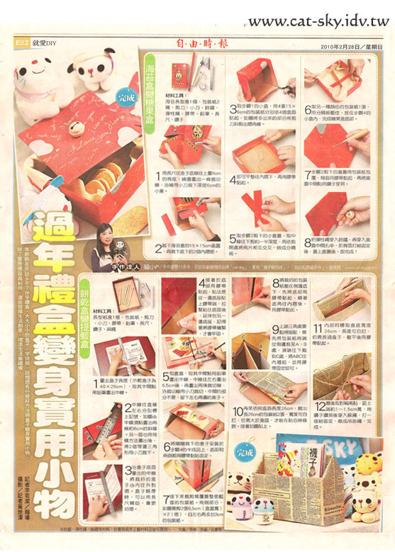 新年期間,自由時報做了一系列有關過年的主題系列報導,其中就愛DIY單元請貓小P來教讀者將過年禮盒再利用製作成實用收納盒。於20100228(日)刊出了。