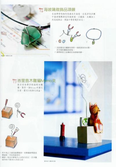 今年的6月中終於有機會到馬祖一遊,就在有著臺灣愛情海之稱的北竿芹壁海邊撿了幾顆海玻璃,我將它們做成了項鍊,戴著它就讓我想起曾經到了一個浪漫又清靜的海邊;而到了巴里島絕不能不帶回的木雕貓,我製作了一個木頭Memo座,讓貓咪坐在上面,可以當名片架或火柴盒的收納架來使用。