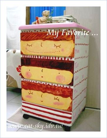 你的家是否也有醜醜俗氣的家具呢?是否常想著把它換掉,卻又覺得浪費可惜呢?不妨將它改造一下吧!彩繪也是一種改造,簡單的畫出喜歡的或可愛的圖案都可以,像我就把櫃子畫上小孩笑臉,也許就是描繪自己的一種方式,畫出自己的喜怒哀樂!