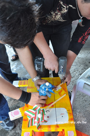 活動中大家都很忙,尤其是帶著工具趴趴走佈置風車的苦力組,他們完全沒有空擋,一直到下午兩點,下雨了,人散了,有些人都先回家了,才有機會找到喵拔請他幫忙釘風車.這一刻我的眼淚都快掉下來了..