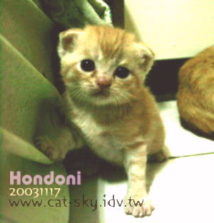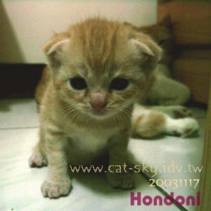 [小紅豆是不是摺耳貓呢?] 從小紅豆出生第一天, 就覺得牠的耳朵有個摺痕, 但因為小紅豆太小 ,一切都要等牠長大一點才能確定是不是摺耳. 這一段時間,不經意拍出小紅豆看起來沒有耳朵的樣子,真是好可愛啊! 只差沒把牠染成藍色的就變成小叮噹了!哈哈! 這一張照片可以看出小紅豆"摺耳"的樣子! 難怪! 個性有點小倔喲!!! (似乎摺耳貓的脾氣都很倔喔!?) | |