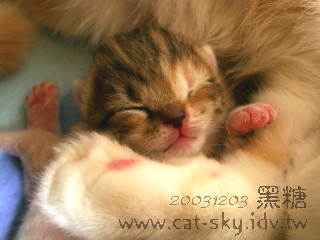 每次看著小黑糖,心中總有甜甜的感覺。她一生下來身體就非常虛弱,攤在醫生的手裡,不斷的撫摸急救,終於牠呼吸了一口氣,心開始跳動了...;這樣一隻好不容易活下來的小小貓,現在正逐漸安穩健康的長大著...。看著小黑糖安靜的睡著,總嶀¶給我溫暖與平靜的感覺... |
